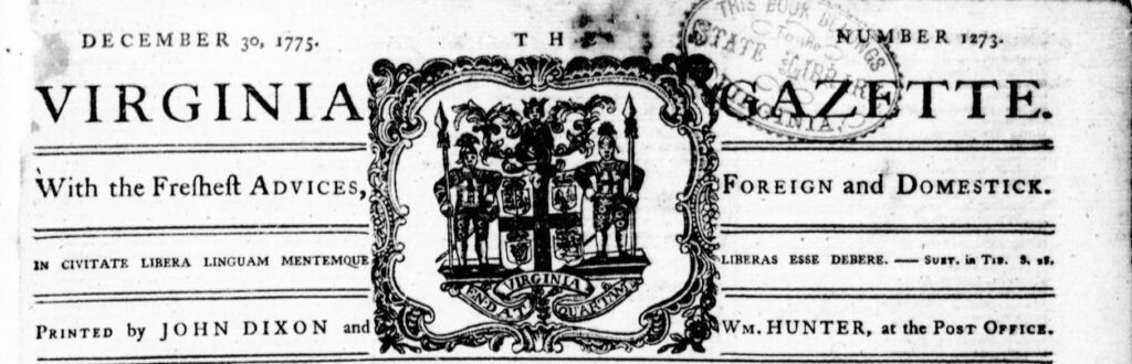 The Virginia Gazette masthead from December 1775, with a British royal style illustration