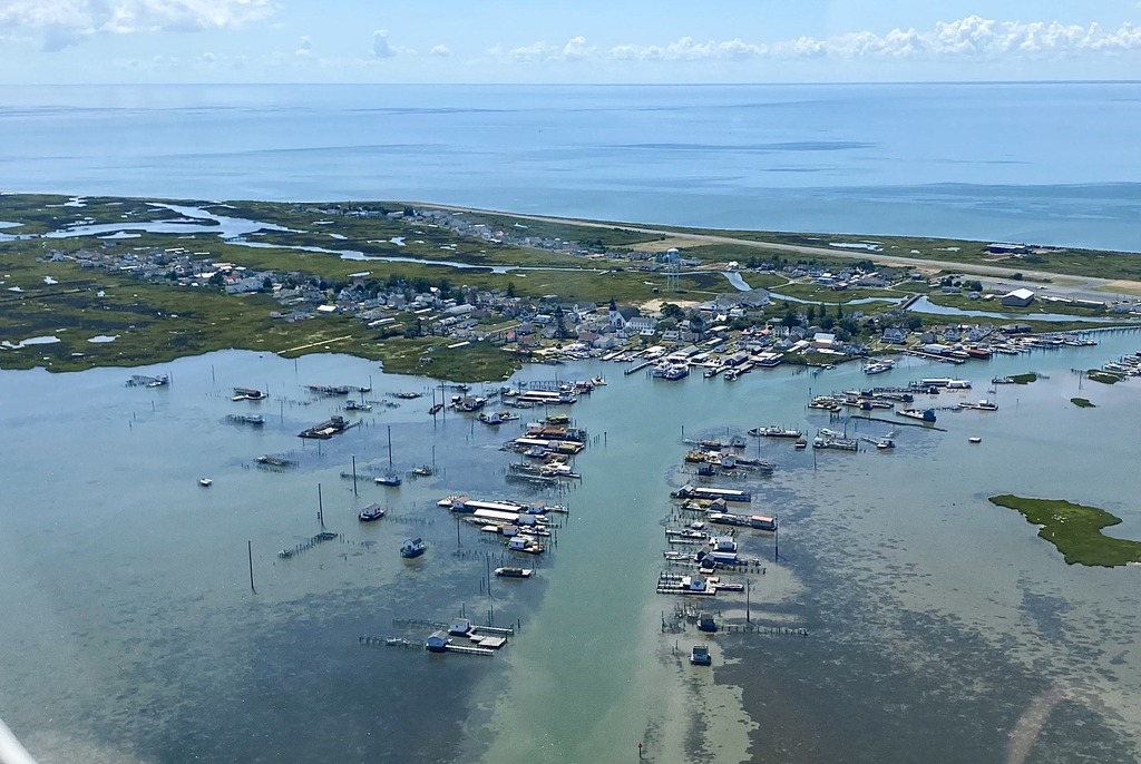 Aerial view of Dock entry at Tangier Island; photo by Kyle Griffith in 2022