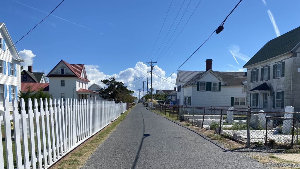 Common street view at Tangier showing homes and graves; photo by Kyle Griffith in 2022